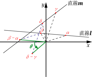 右図に示すように複素平面上に直線 l , m あり直線 l 上には複素数 α , β 直線 m 上には複素数 γ , δ がある。この場合直線 l と直線 m のなす角 θ は